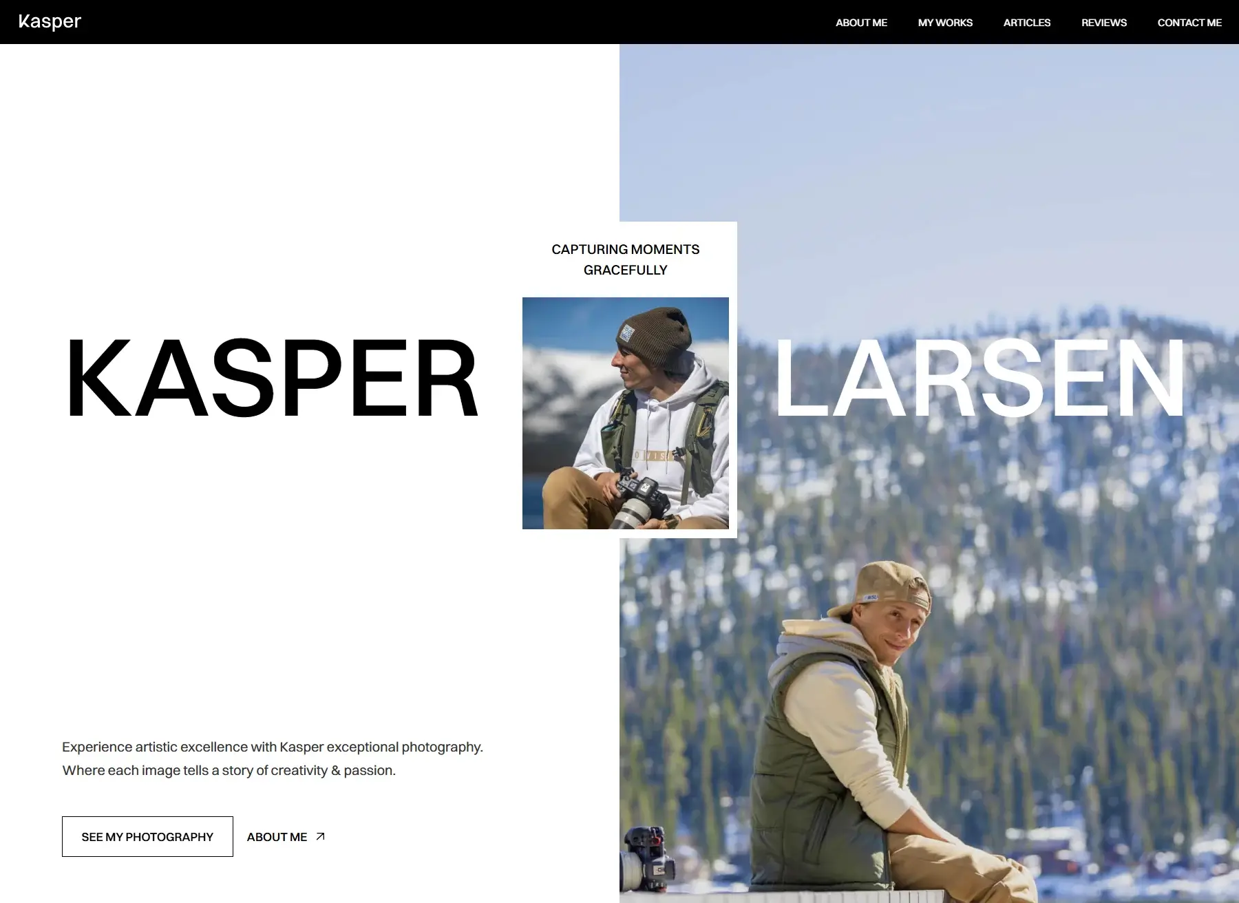Kasper Webflow template is a great fit for photographers, freelancers, photo studios, videographers, and other creative individuals. It's designed to help you showcase your best work online easily