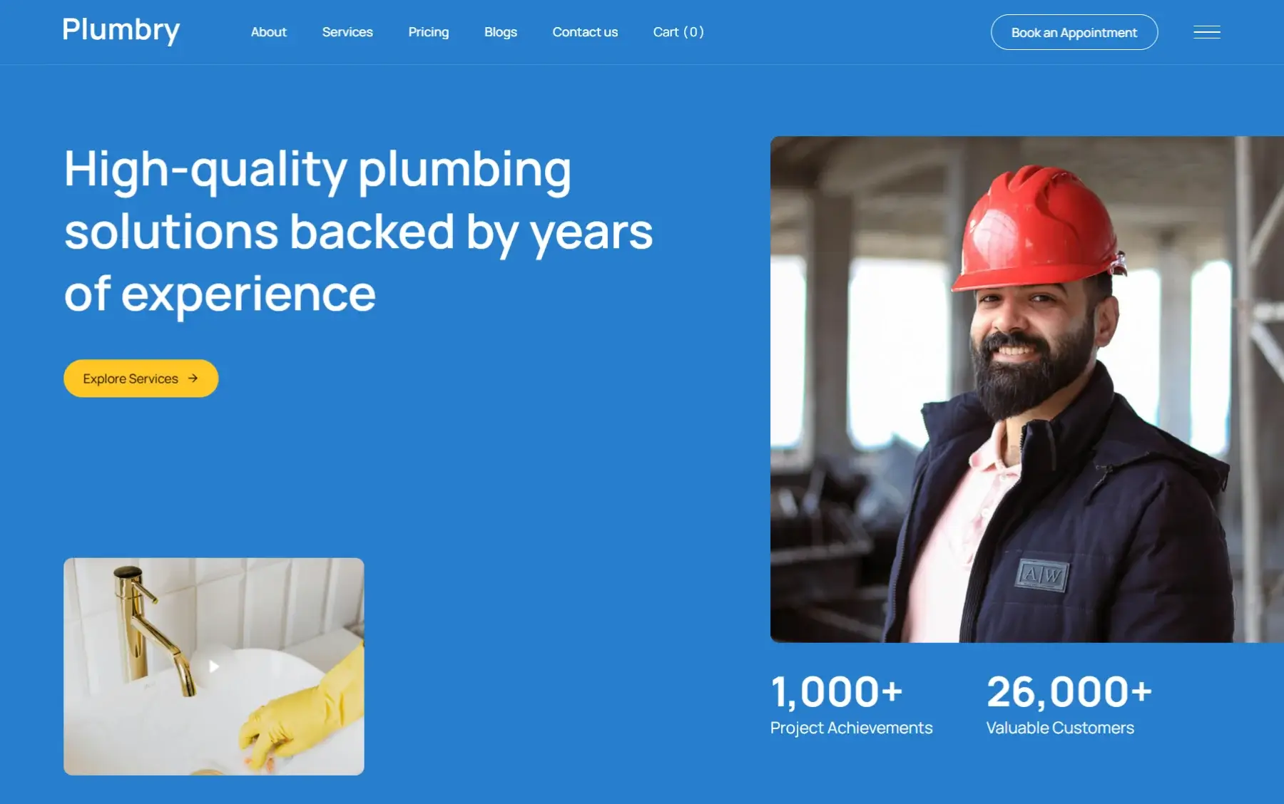 The Plumbry Webflow template is specially designed for plumbing and handyman services. It's perfect for agencies looking to grow their business, offering templates for construction, repair, painting, plumbing, renovation, and roofing services.