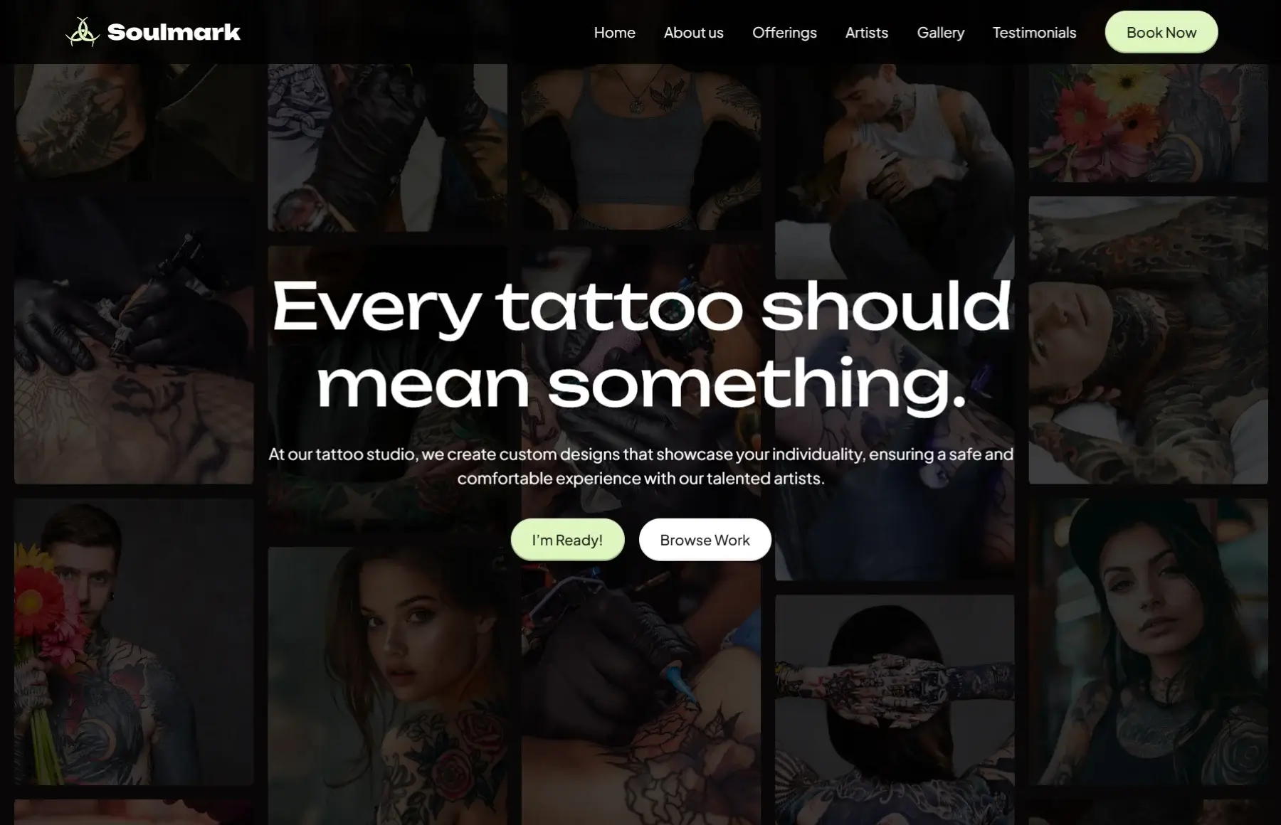 Soulmark is a minimal, dark Webflow template for tattoo shops, featuring a sleek layout, responsive design, and easy customization.